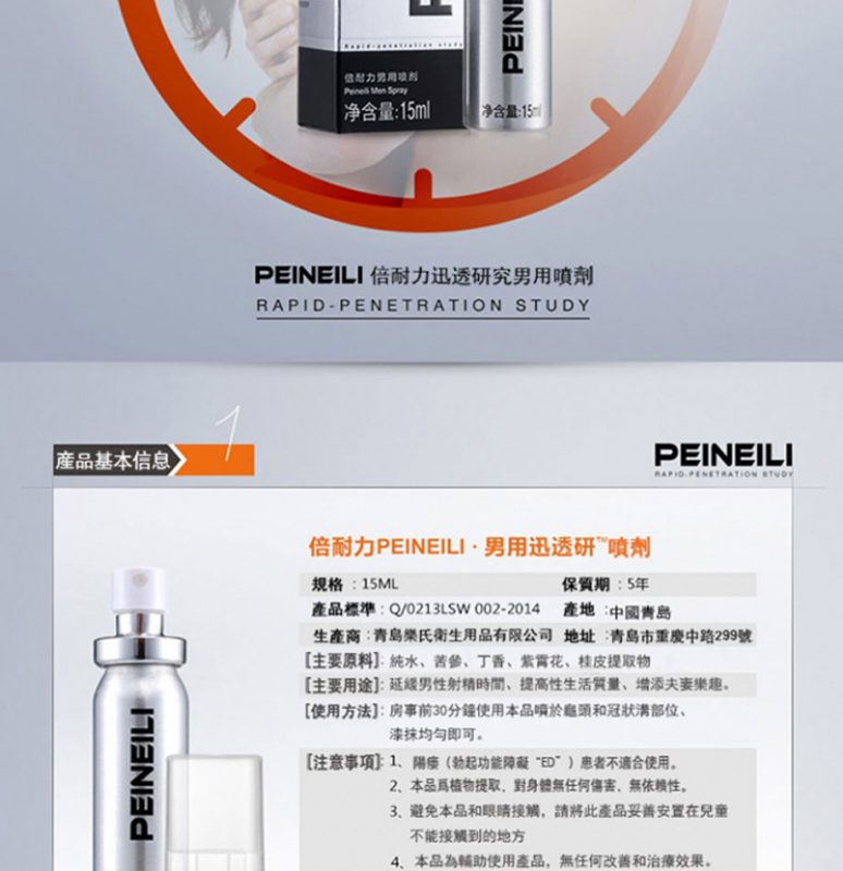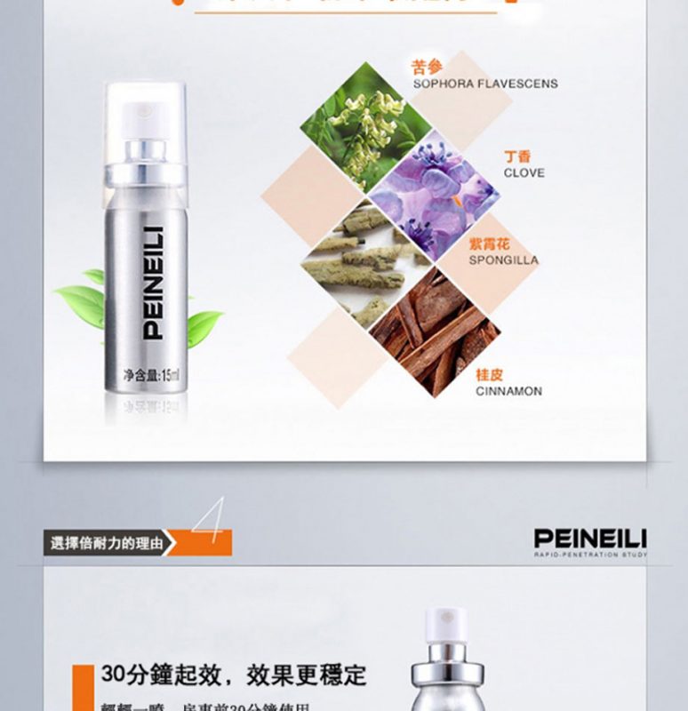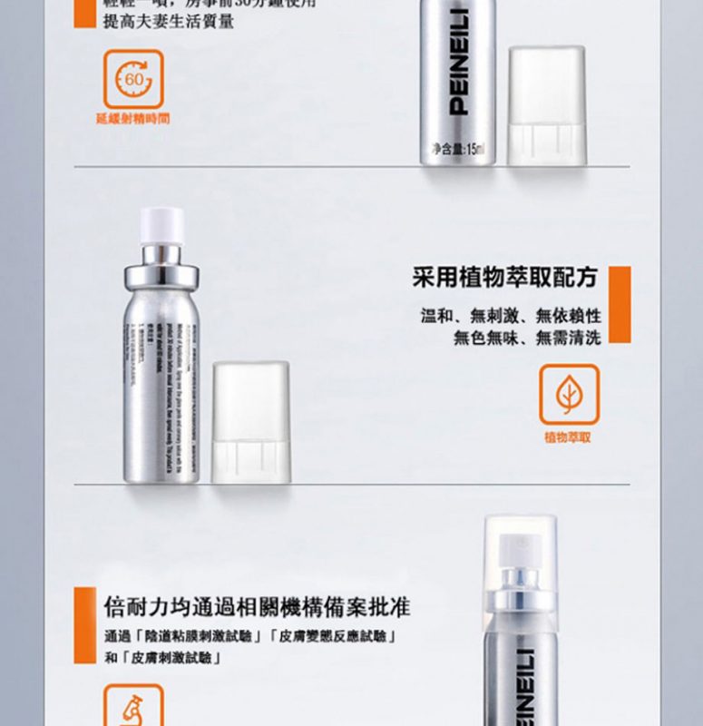 倍耐力持久液屬於成人用品類,可有效的緩解男性出現的不硬、時間短、不舉等現象。倍耐力延時噴劑主要原料由蛇床子提取物、丁香提取物、紫霄花提取物、桂皮提取物等原料組成,采用現代生物科技和純天然中草藥配方精制而成,可有效的防止早瀉,改善體質功效。倍耐力延時噴劑方中的桂皮提取物含桂皮醛、丁香酚等,並含鞣質及粘液質。對人體免疫功能有明顯的增強作用,其作用機理是,其可增強人體T淋巴細胞和B淋巴細胞的增殖與分化,以及殺傷細胞的殺傷功能以及單核吞噬細胞的吞噬功能。只要在房事前15分鐘使用本品噴於龜頭和冠狀鉤部位,塗抹均勻,其有效延時時間是有60分鐘的。並且,倍耐力延時噴劑具有固本生精、抑制早泄、溫經通酪、激情動欲、興奮神經、促進勃起、預防性病傳播等功能。