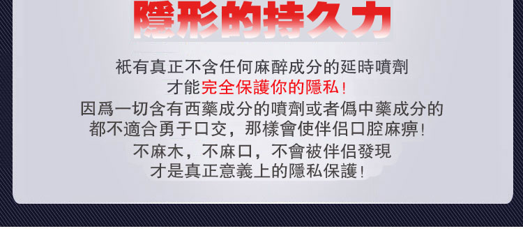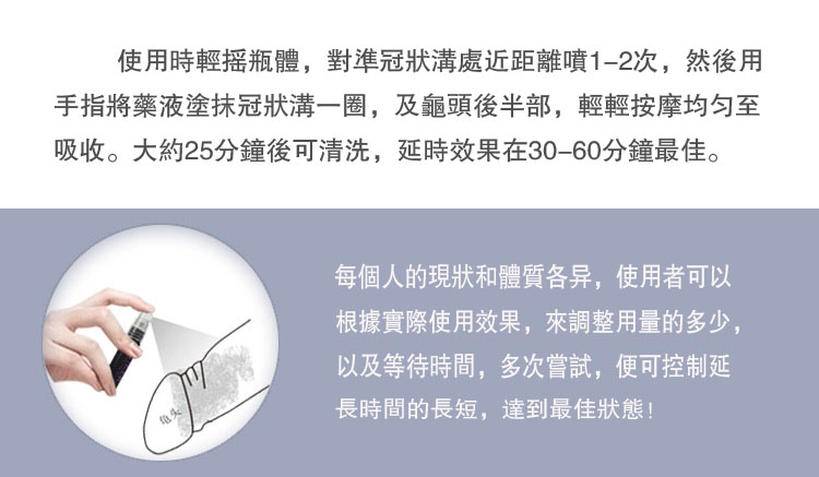本產品標榜純天然成分萃取,非醫師處方藥品,主要透過物理性原理與草本精華協助降低敏感度,達到延時效果。