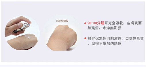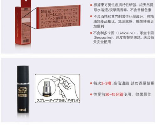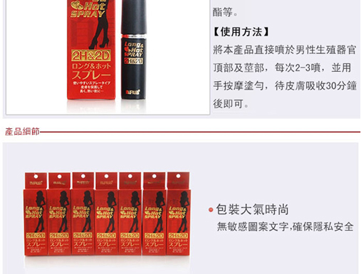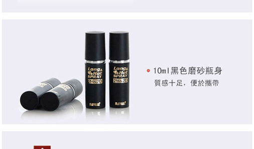 【使用方法】:取本品直接噴塗於男性龜頭冠狀溝部位(可用手指塗抹均勻盡量避免觸及尿道),每次噴1-2下手指塗勻,並輕輕按摩龜頭促進吸收,30-40分鐘後藥效可達峰值即可房事。