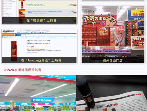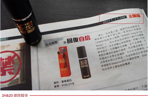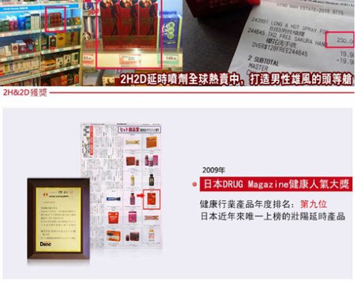 作為日本丸榮集團推出的全球首個天然外用延時產品。2H2D延時噴劑於2008年在日本上市,該品甫壹露面便震驚業界:全部采用天然草本原料,全球唯壹通過提取中藥成分,實現超長延時的外用產品。首創三角循環機理,效果相乘而非相加,最高可延時可達30分鐘以上,堪稱外用早泄產品中的“終結者”,2H2D持久液已連續三年蟬聯日本延時產品銷售冠軍。