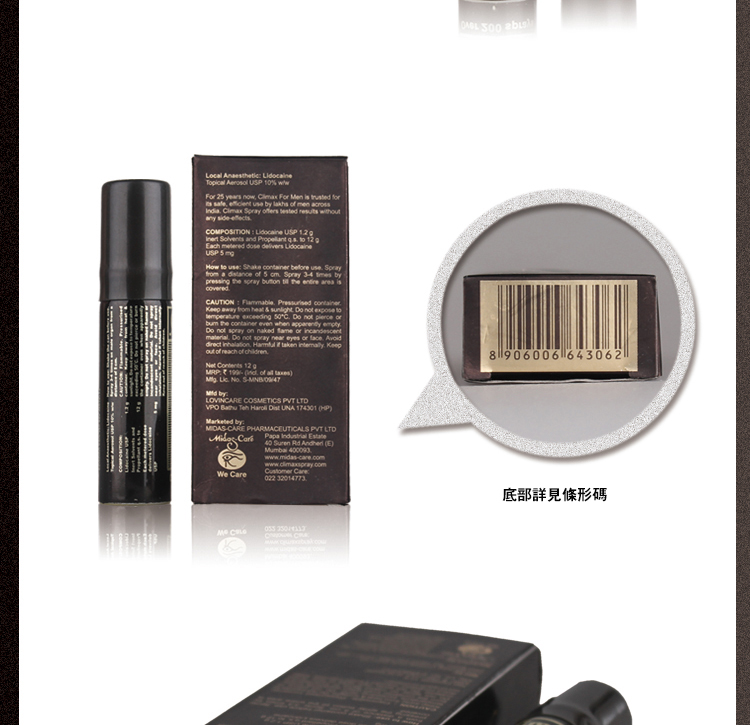 Climax延時噴劑 Spray創始於1986年,是一款專門為男士設計的延時噴劑,從廣告語“A world quality for real men”中可見壹斑。其母公司是印度的醫藥生產商Midas-Care生物醫藥公司,產品涵蓋註射劑、口服液、糖漿劑、片劑、膠囊劑、顆粒劑和噴劑等7個劑型,旗下擁有Fast Aid Kit,Reli Spray,Coolex, Climax Spray,Spraymintt,Vinodine等多個知名品牌、享有極高的消費者信任度和美譽度。Climax伴隨著Midas-care的創立而誕生,是其最引以為傲的產品之壹,其配方經過不斷發展和完善,現如今對房事質量的提升效果已經非常顯著。