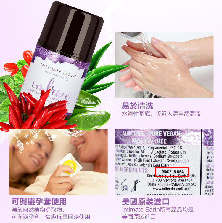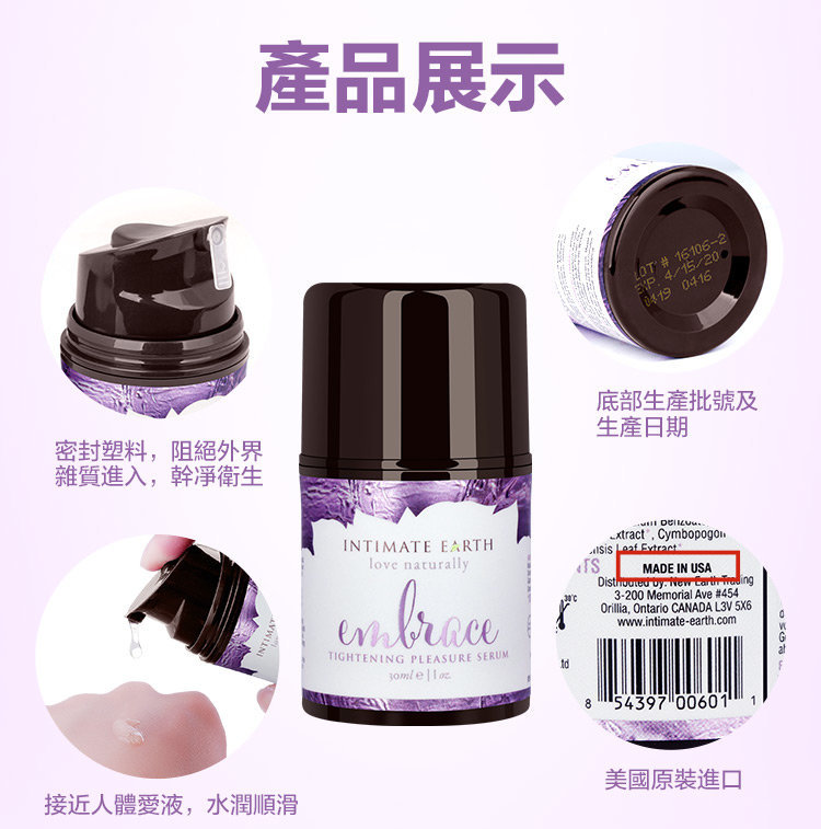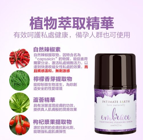 Intimate Earth Embrace 為緊緻高潮精華凝露,為純植物萃取物為基礎的水性潤滑凝露,含有經過USDA美國農業部安全認證的有機提取物和天然辣椒素,葵花籽油和杏仁油,份外滋潤。獨特的配方能有效短暫緊緻陰道組織,強力提升做愛時二人快感及興奮度,令性愛時更易達至高潮。