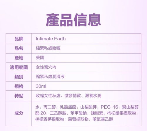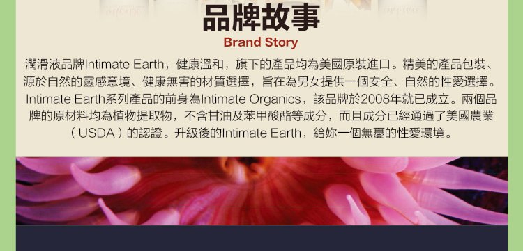 Intimate Earth為來自美國的情趣品牌,以天然有機的草本原料結合成高級情趣昇華產品。
